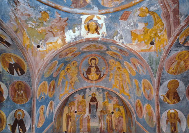 Согласно договору, в четверике предполагалось написание в общей сложности сорока сюжетов. На сводах некогда находился страстной Христологический цикл («во сводах писать Страсти Господни»), который на сегодняшний день утрачен. На южной и северной стенах росписи были организованы в четыре яруса и располагались в простенках верхнего и нижнего уровней света. По договору эти росписи посвящались Богоматери: «…из книг Руна Орошенного да Звезды Пресветлой чудеса Пресвятой Богородицы», т. е. сюжеты акафиста, чудес и праздничного Богородичного цикла. От этих циклов сохранились фрагменты двух композиций на южной стене.